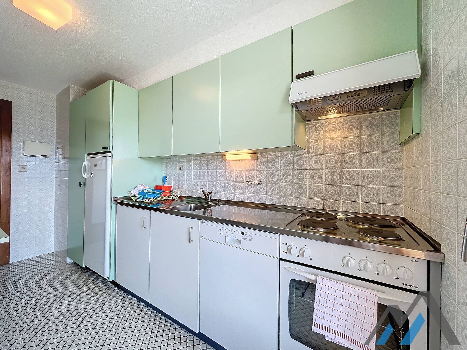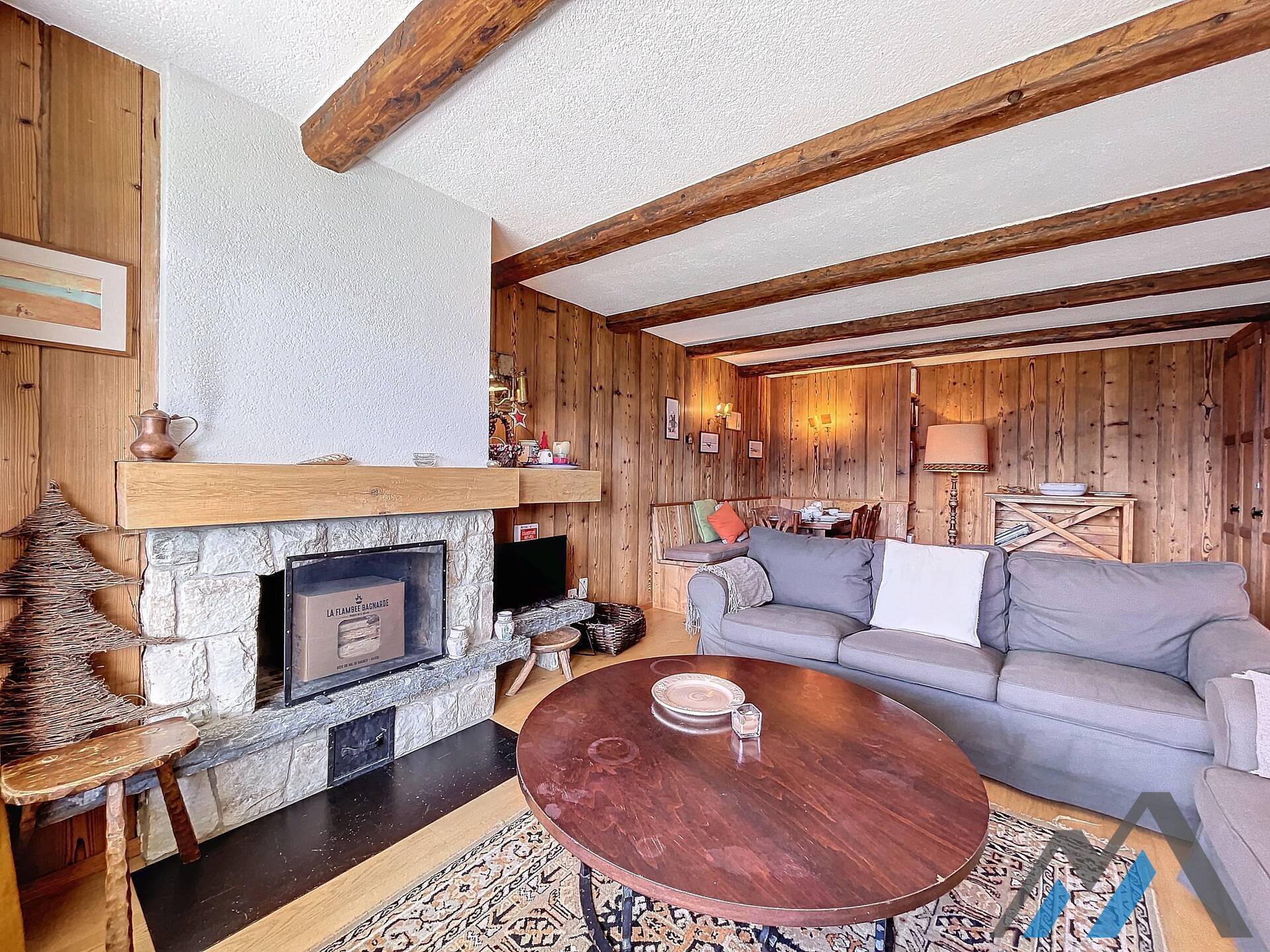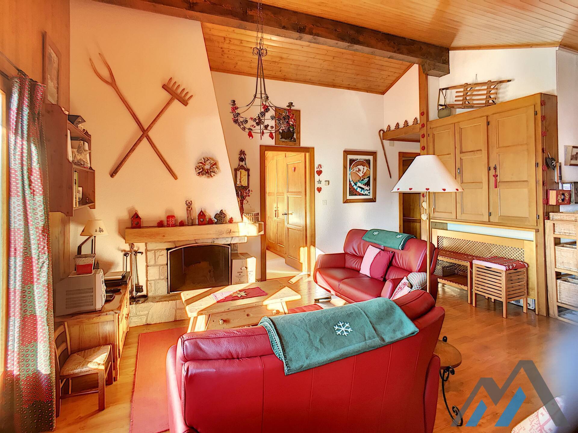Living room with fireplace and eating corner,, kitchen with 3 hotplates and dishwasher, one bedroom with double bed, one bedroom with two be
