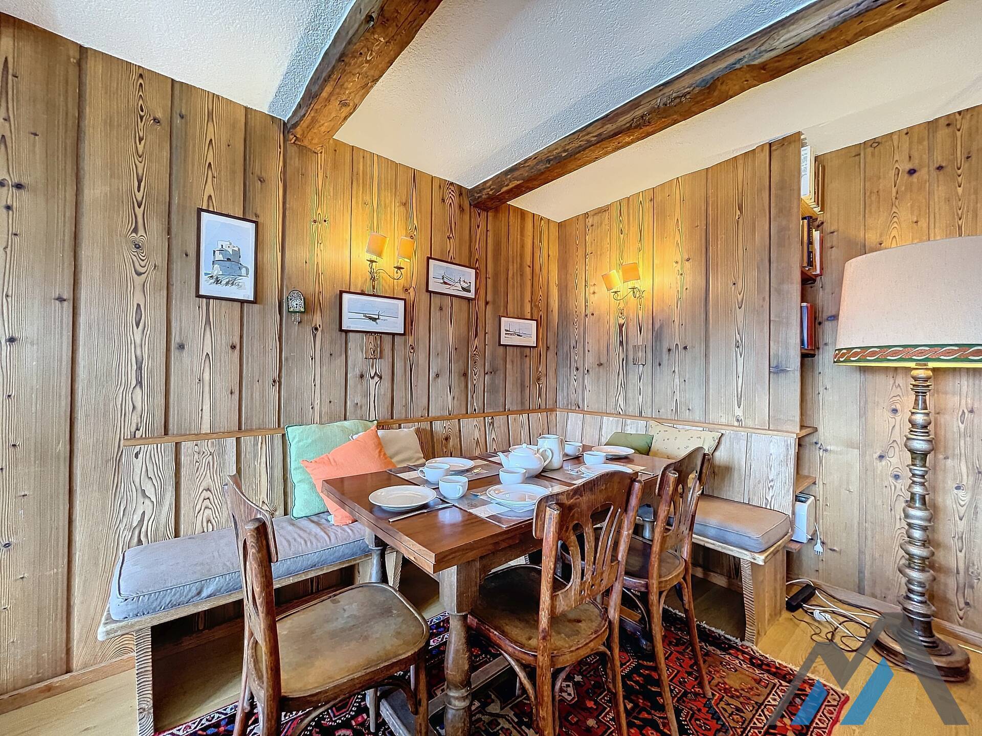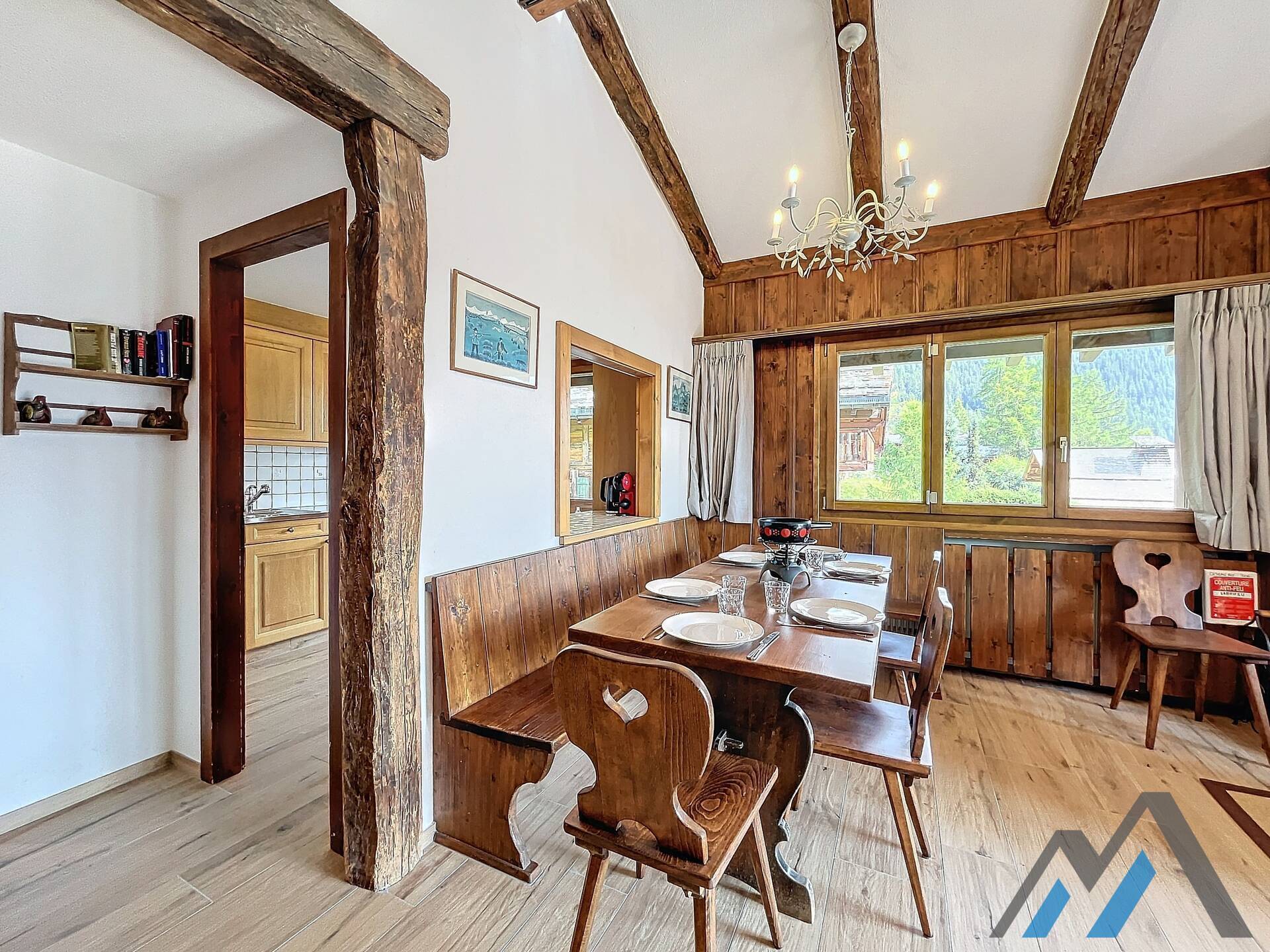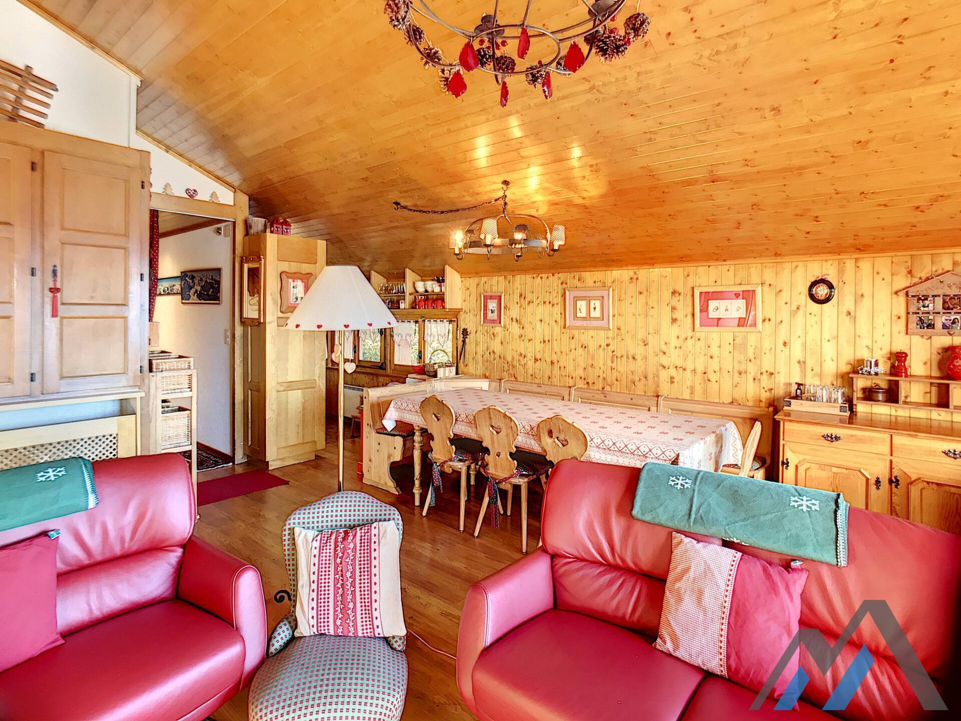 Living room with fireplace and eating corner,, kitchen with 3 hotplates and dishwasher, one bedroom with double bed, one bedroom with two be