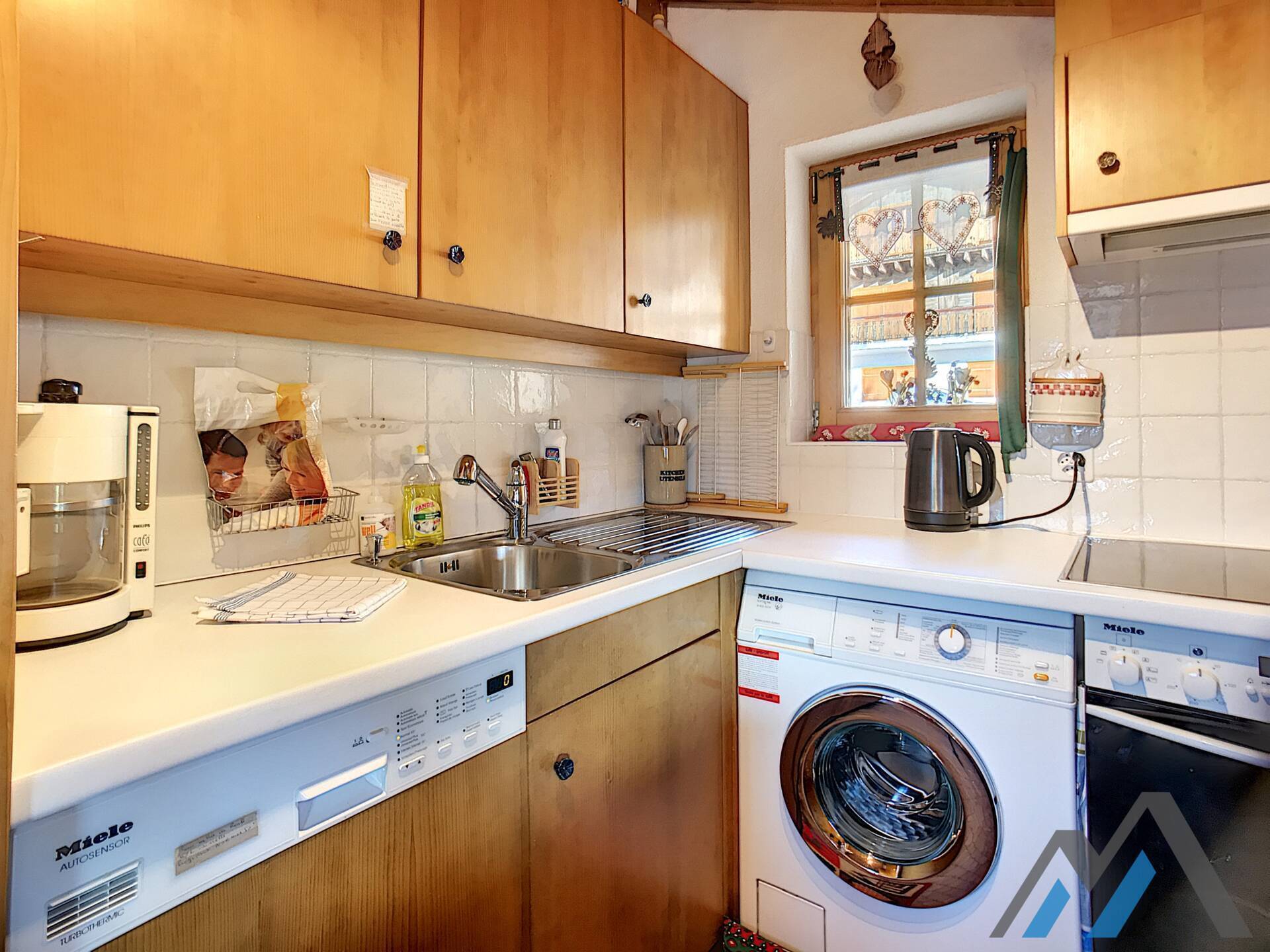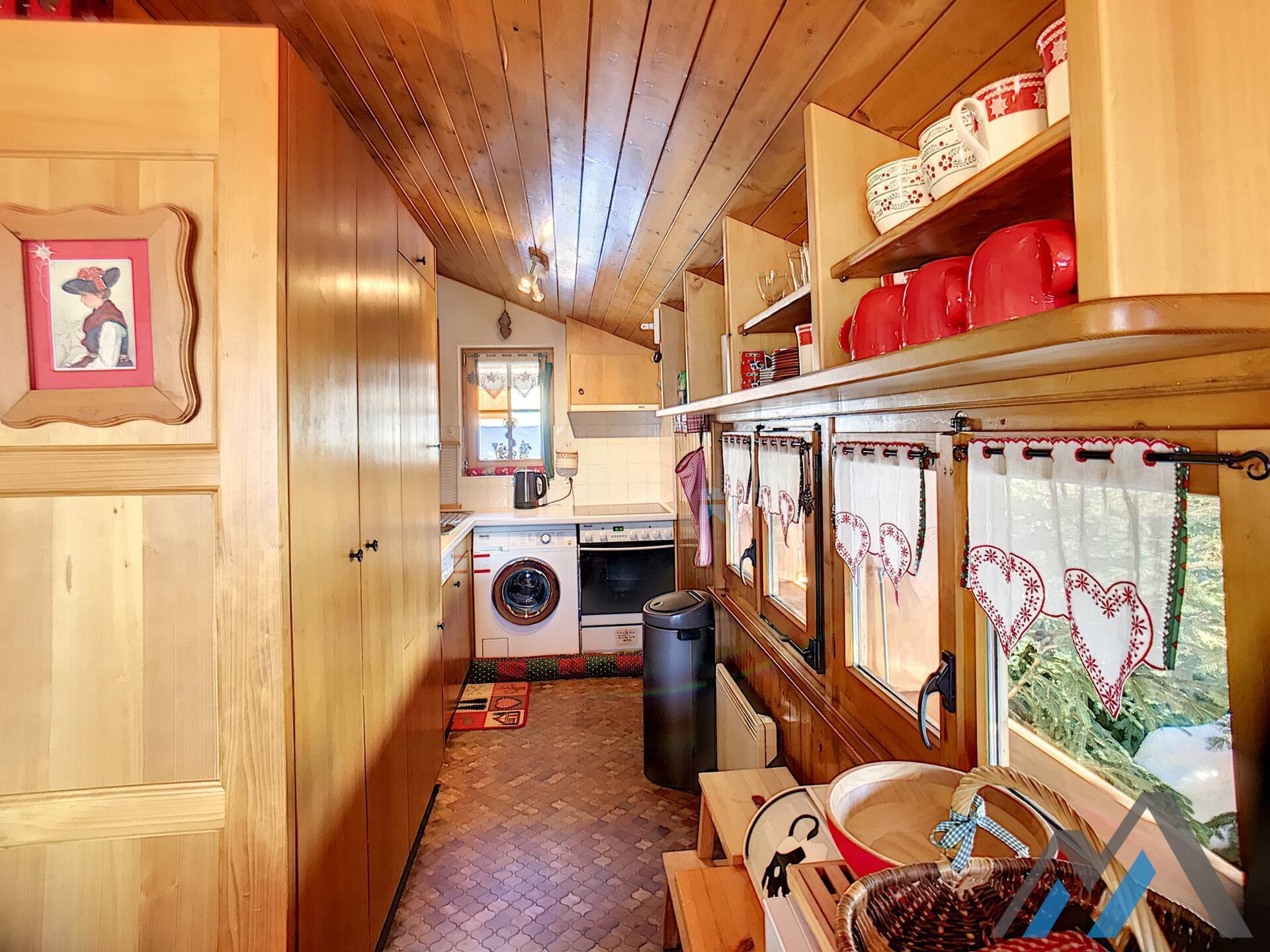 Living room with fire place, kitchen with vitroceram, dishwasher, microwave and washingmachine, eating corner, one bedroom with double bed,