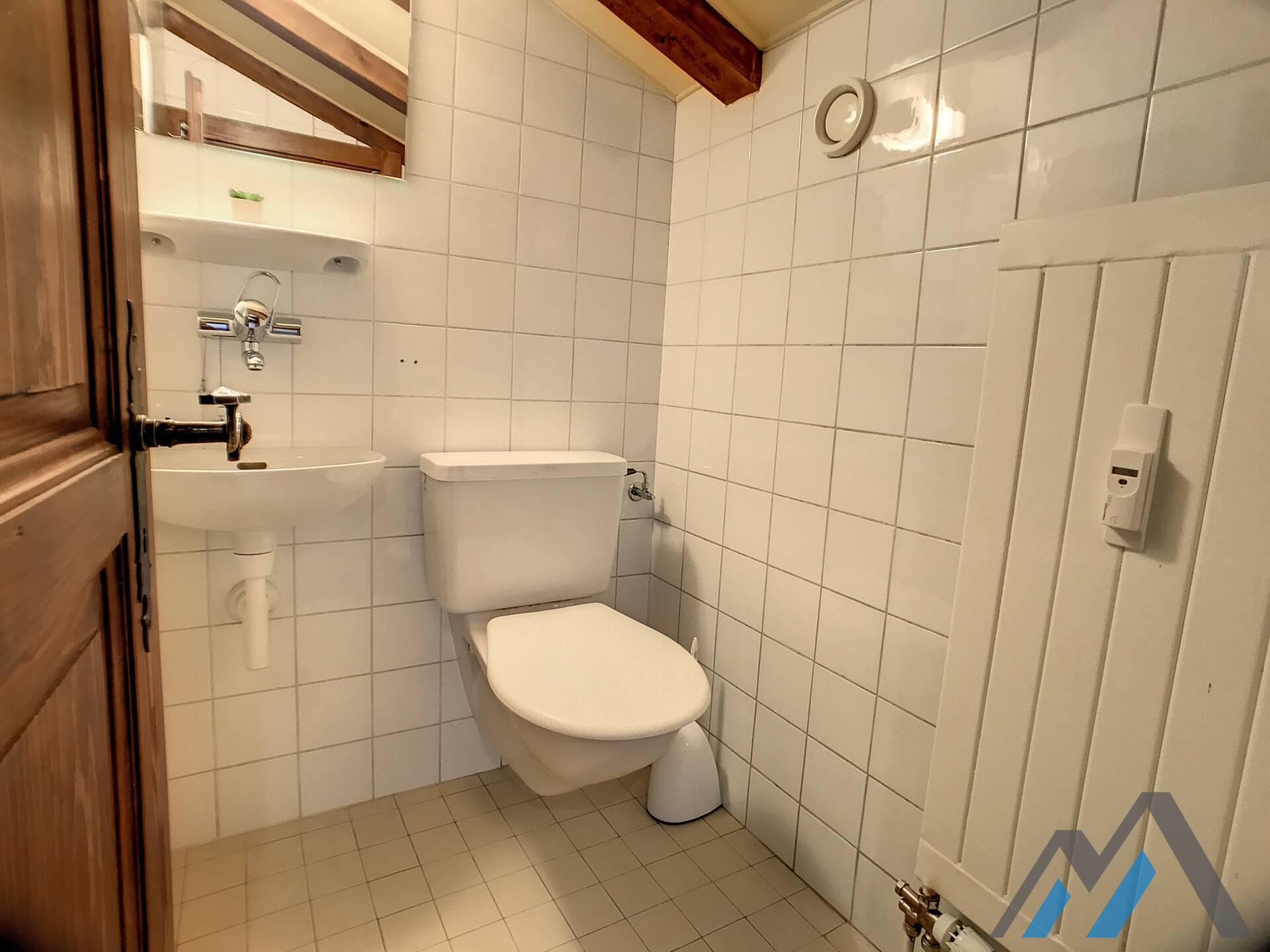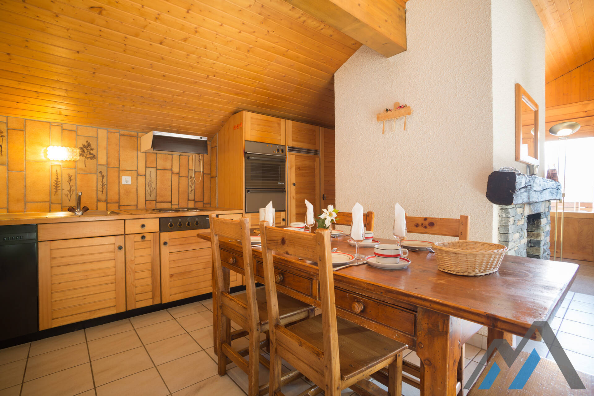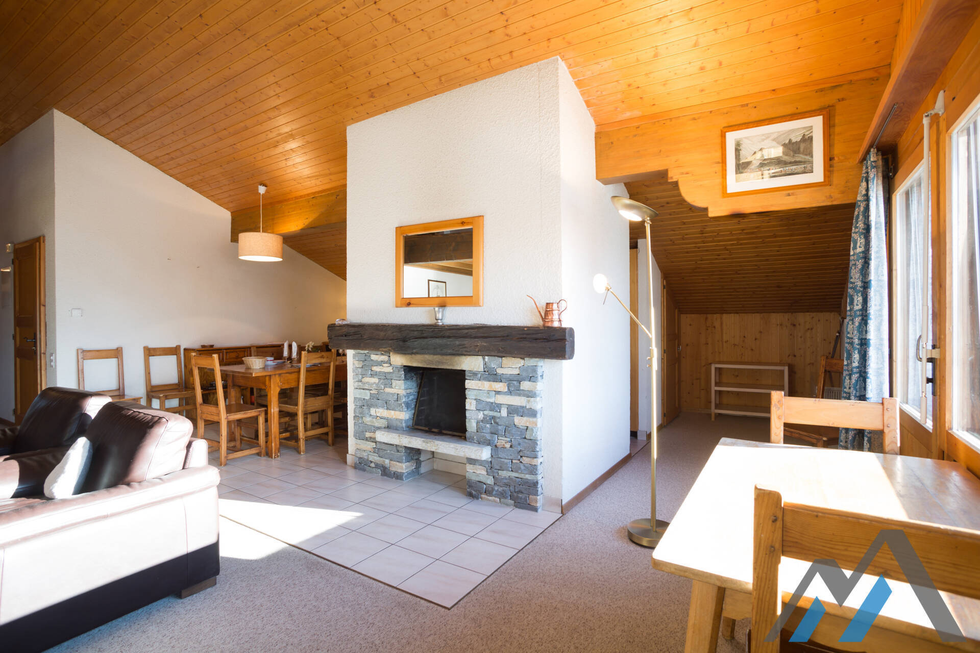 Living room with fireplace, kitchen bar with vitroceram and dishwasher, a shower room with toilet. Floor : one bedroom with double bed and a