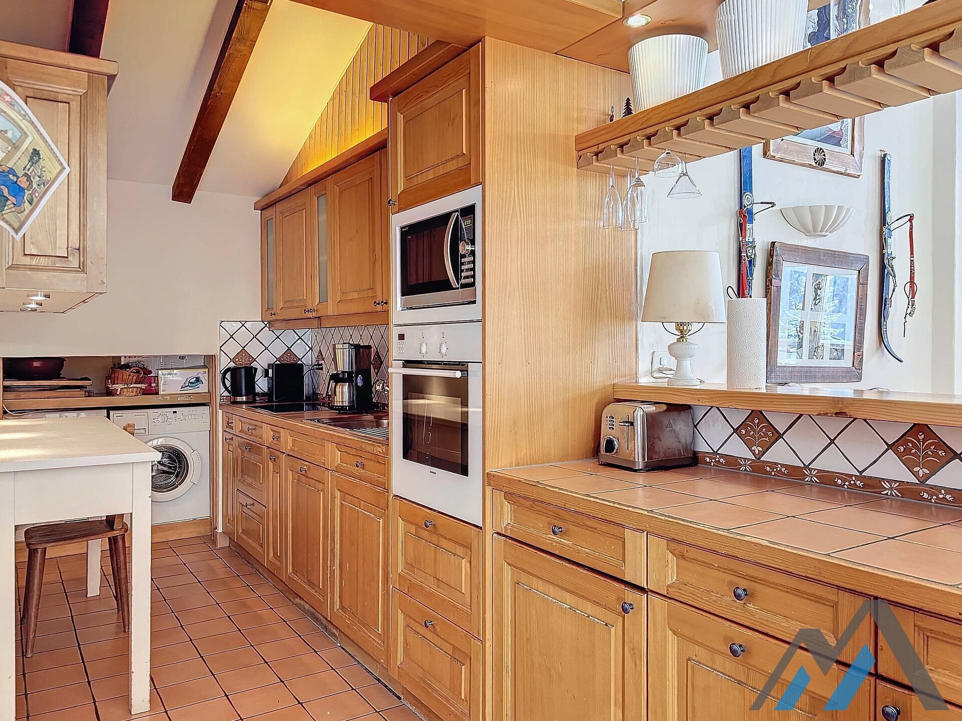 An entrance with a guest toilet, a spacious living room with fireplace and TV corner, an open kitchen with dishwasher and washing machine. A