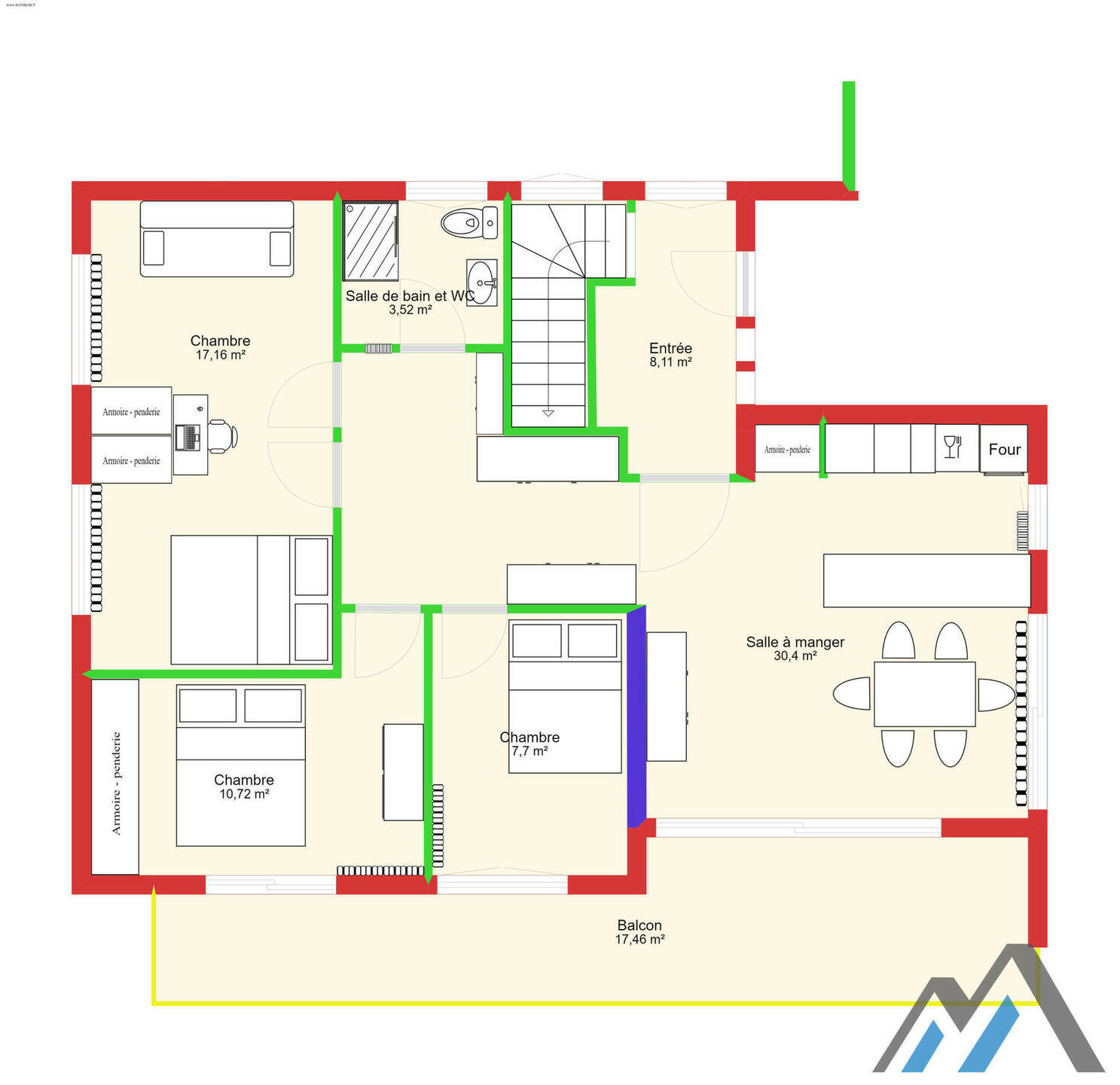• First floor: Landing, one single bedroom, two south-facing bedrooms, one with access to the balcony, bathroom with bathtub, shower, and WC, south-facing balcony.